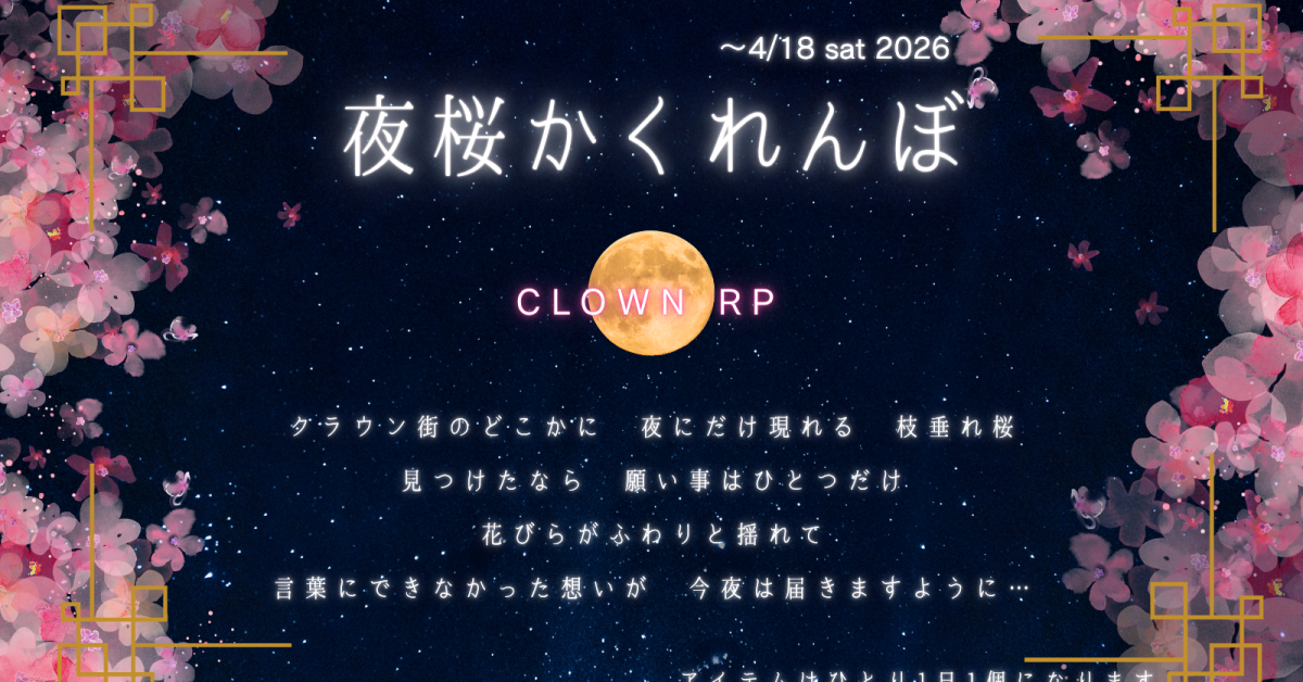 ✨イベント記事 2026.03.31 CLOWNの夜に舞う幻の枝垂れ桜 ~願いを込める夜桜かくれんぼ~ CLOWNの街に、春の訪れとともに、ある神秘的な噂が囁かれています。夜の闇にだけ姿を現すという、幻の枝垂れ桜。『夜桜 … 続きを読む 幻の枝垂れ桜に願いを込めて。夜桜かくれんぼ